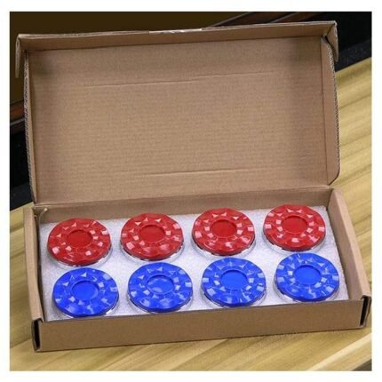 Available in both Chrome and Bronze finishes. Set of 8 shuffleboard pucks, 4 Red and 4 blue Available in Bronze