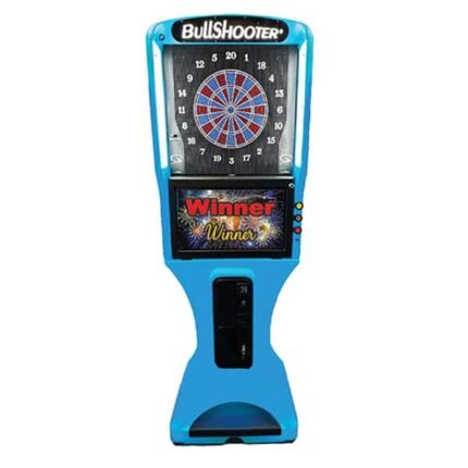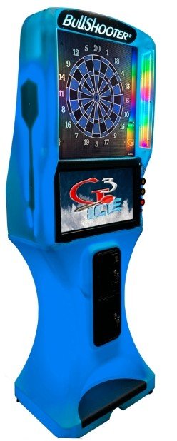 A premium electronic dartboard with glowing ice blue cabinet, worldwide online connectivity, and enhanced gameplay features for commercial dart operations.