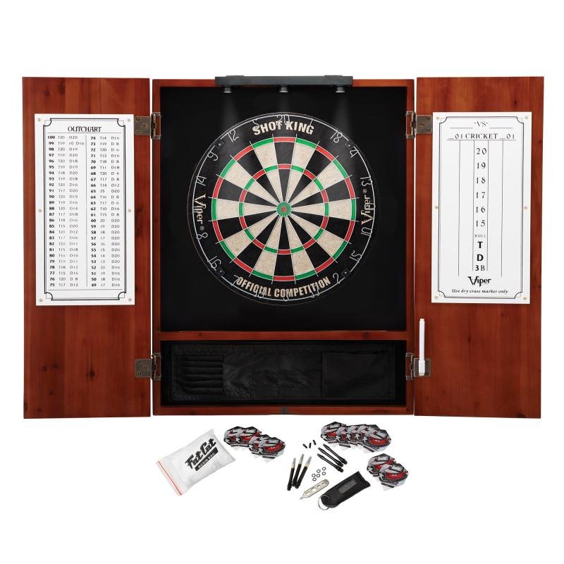 Viper | Metropolitan Cinnamon Steel Tip Dartboard Cabinet | Shot King Bristle Dartboard | Shadow Buster Dartboard Lights, and Fat Cat Steel Tip Accessory Value Pack