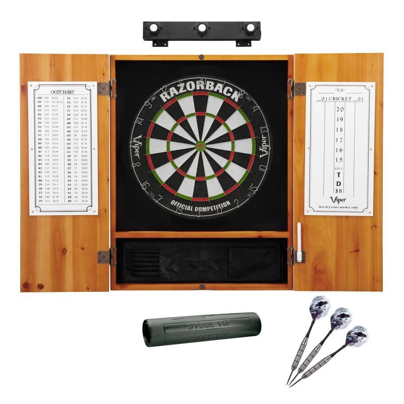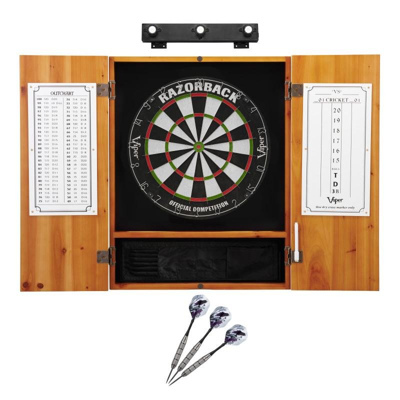 Viper | Razorback Sisal Dartboard | Metropolitan Oak Cabinet | Padded Dart Mat | The Bull Starts Here | Underground The Raven Steel Tip Darts | Shadow Buster Dartboard Lights & Laser Throw Line Marker