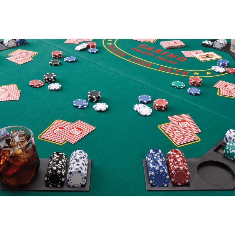 - Drink and chip holders built directly into the table surface allow everyone to organize their chips in front of them and keep your drink from spilling.