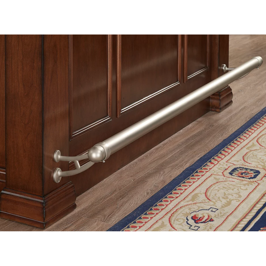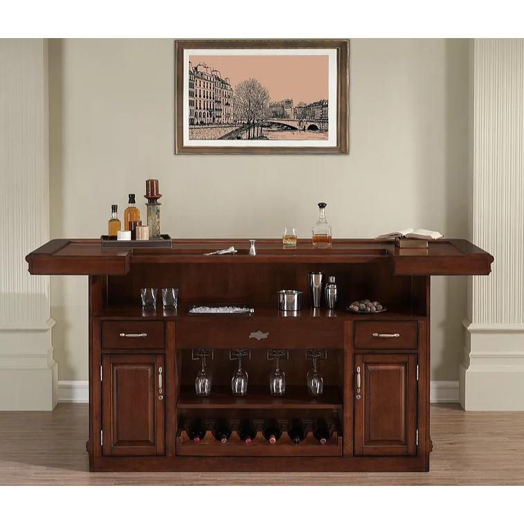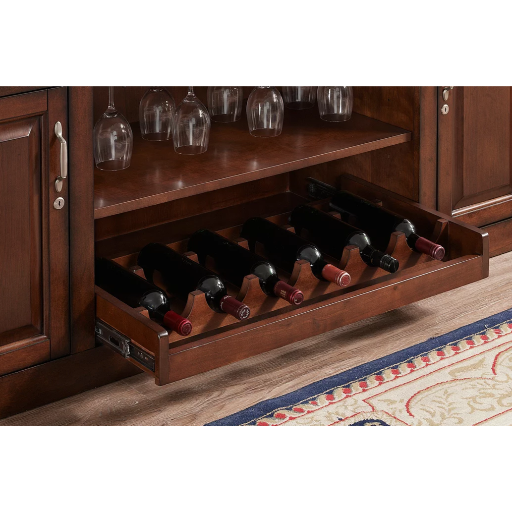 This 88” Bar is finished in Navajo with Brushed Steel accent hardware. It includes a foot pole, ice bucket, glass stemware holders, dual pullout wine bottle storage racks, plenty of storage shelving, locking cabinets and easy-glide storage drawers.