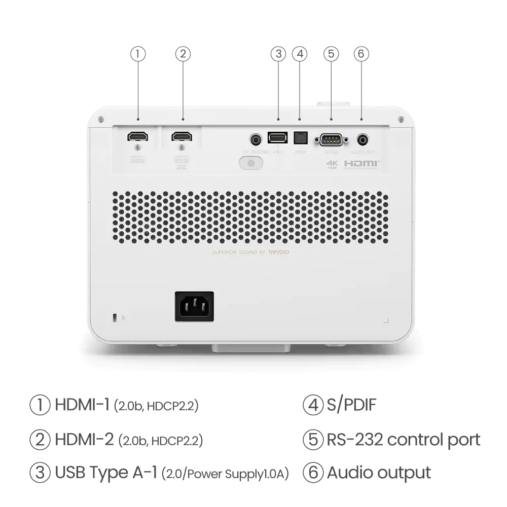 • The projector supports 4K UHD resolution (3840 x 2160 pixels) at refresh rates of 24Hz, 25Hz, 30Hz, 50Hz, and 60Hz. This ensures compatibility with most 4K HDR content sources including streaming devices, gaming consoles, and Blu-ray players.