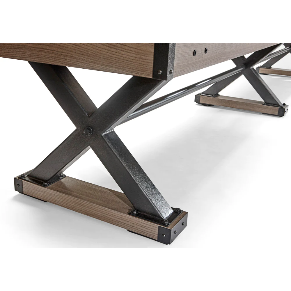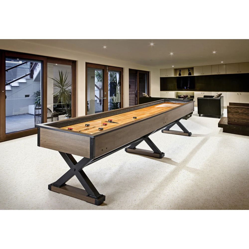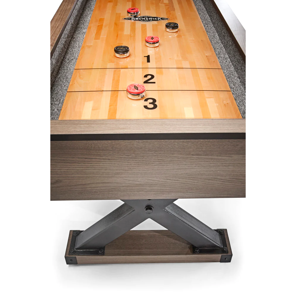 Elevate your game room with the Brunswick Billiards Premier 12′ Shuffleboard Table. Boasting modern yet rugged style and a robust “X” foundation, this shuffleboard table features ultra-clean lines that perfectly match the popular Premier Air Hockey and Premier Foosball suite.