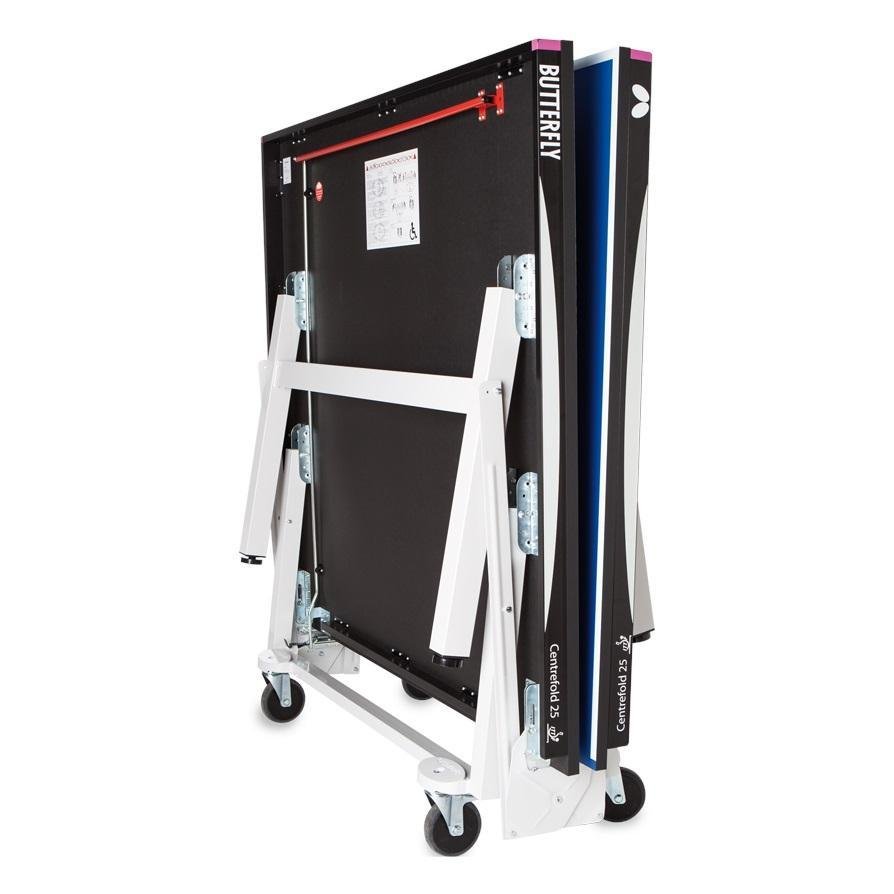 The Centrefold 25 preassembled tables are a one piece, fold and roll. Legs are placed 400mm inward which complies with the ITTC ruling for wheelchair competitors. One inch scratch-proof top surrounded by a hard PVC band and strong two inch steel rim. Gray steel frame with adjustable feet for leveling the table.