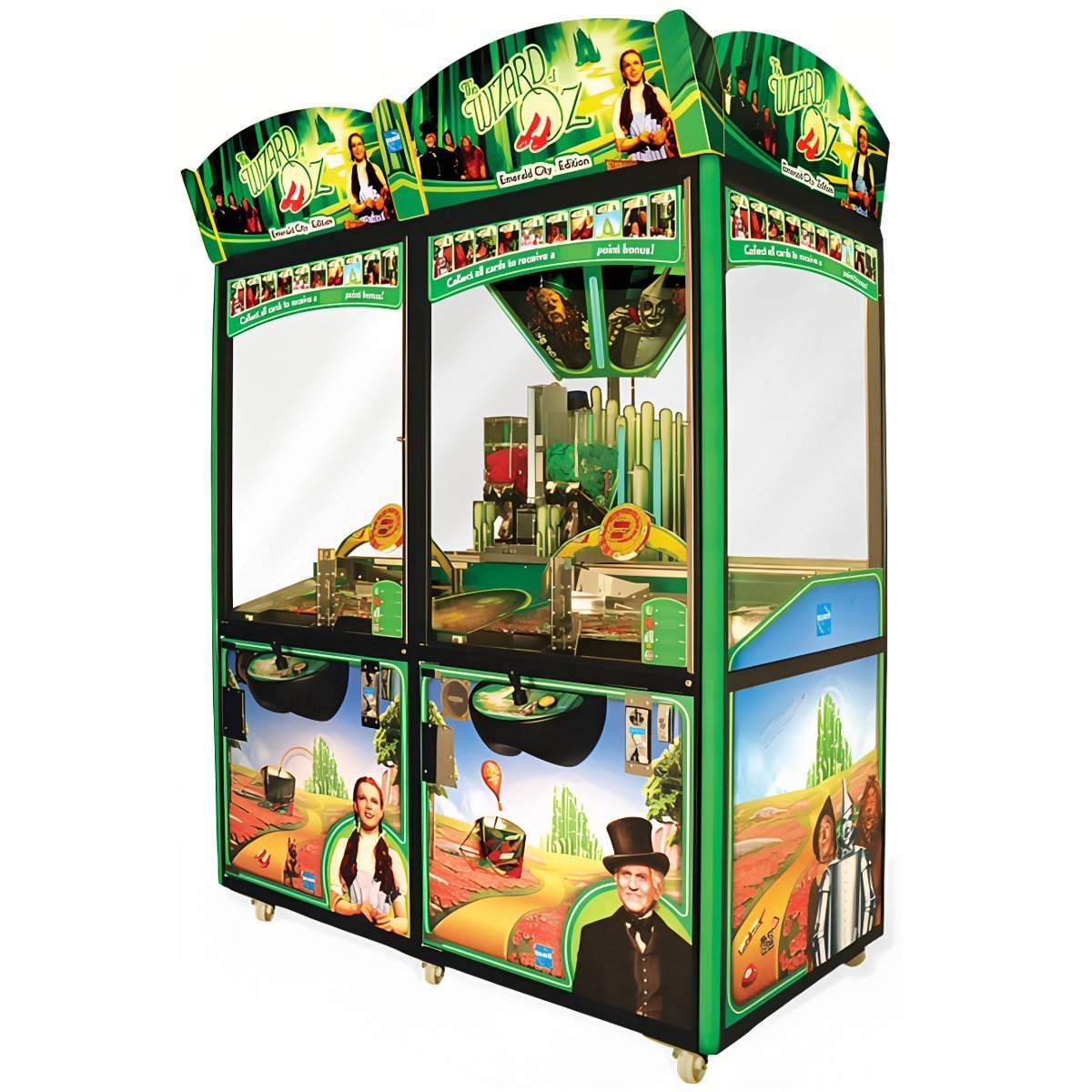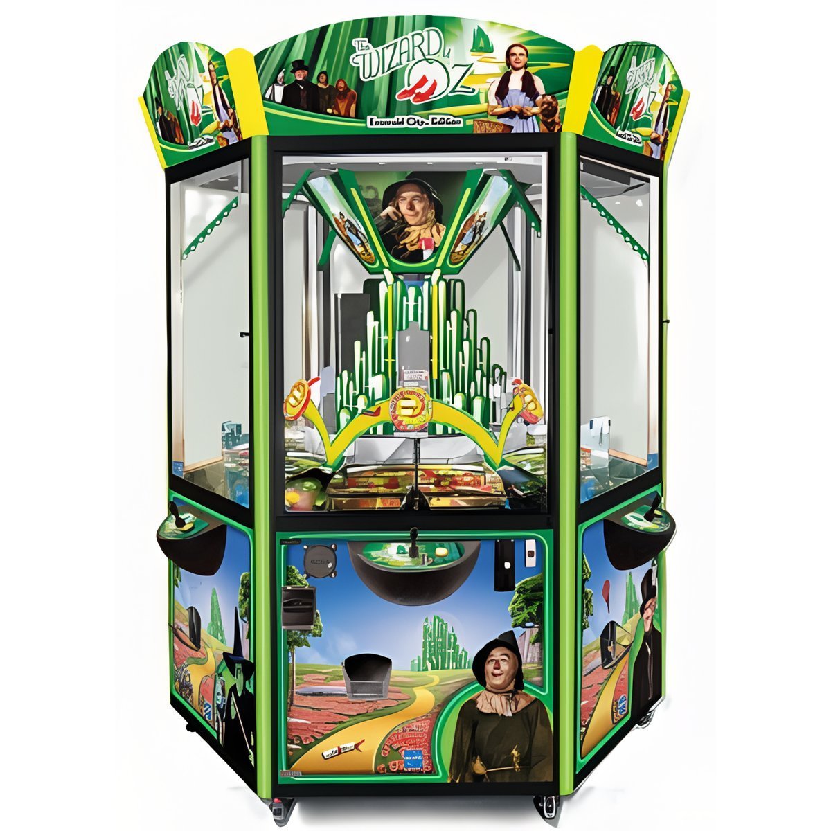 The Emerald City Edition brings the magic of the Wizard of Oz to life with its vibrant emerald glow, creating a stunning contrast against matte black profiles. This Elaut amusement coin-pusher features captivating cabinet artwork with iconic characters and scenes from the classic 75-year-old film, drawing fans of all ages to play at their favorite character’s station. Inside, replica Emerald City towers enhance the theme, making the game a visual delight.