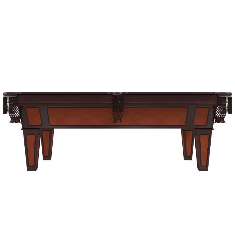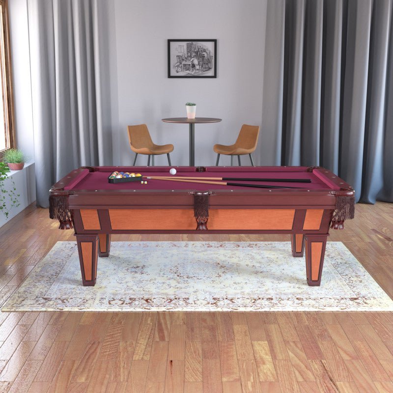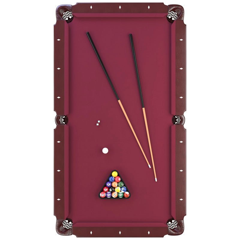 The rich wine-colored cloth cover, French style drop pockets, and dark cherry finish make it the perfect addition to any game room. The Reno pool table comes with everything you need to play: a complete set of billiard balls, two 57” cue sticks, one resin triangle, two pieces of cue chalk, and a rail brush.