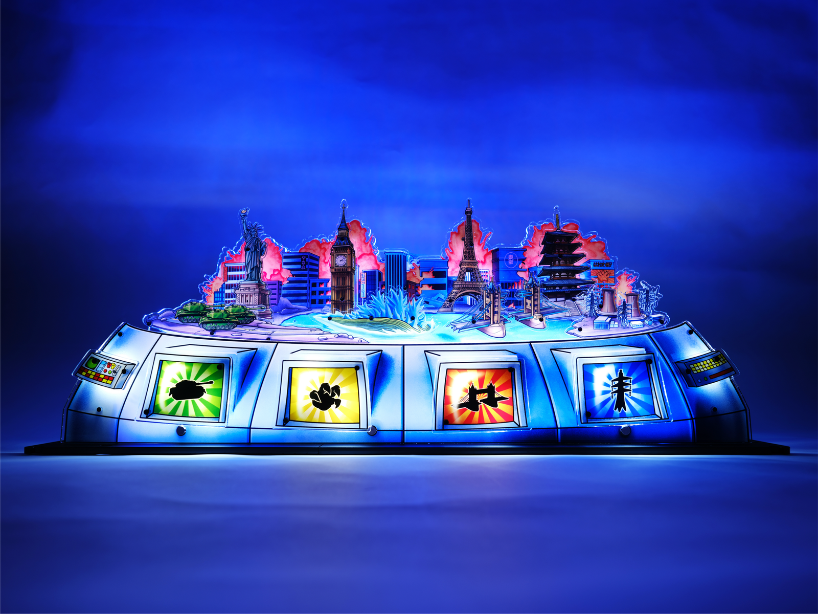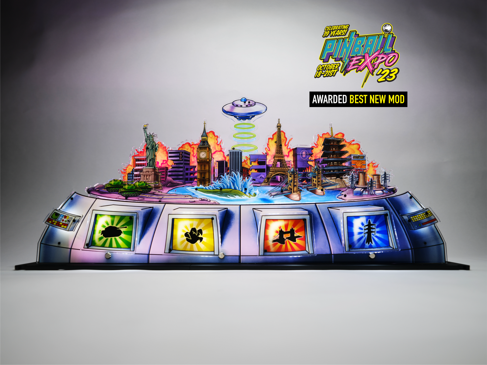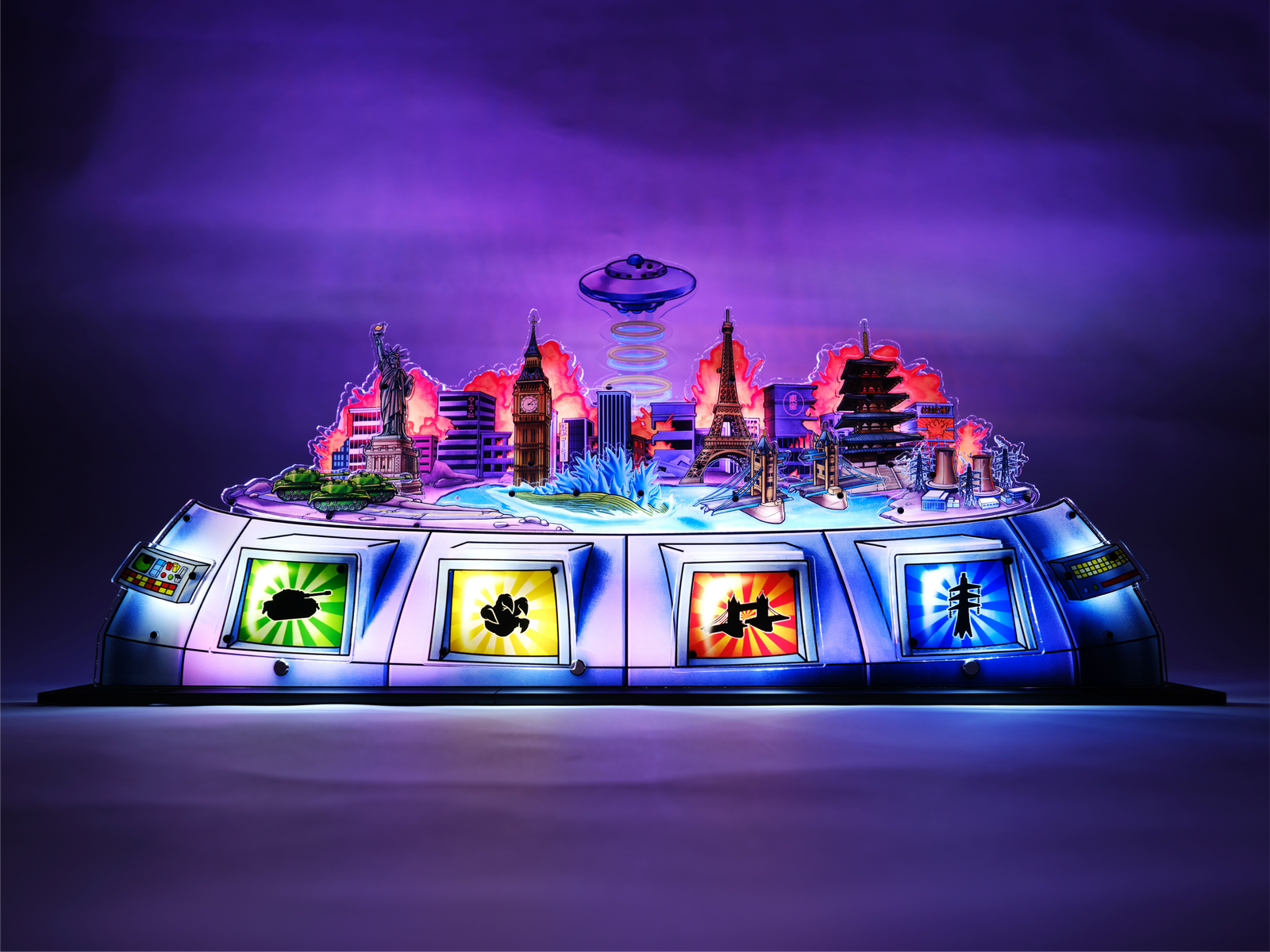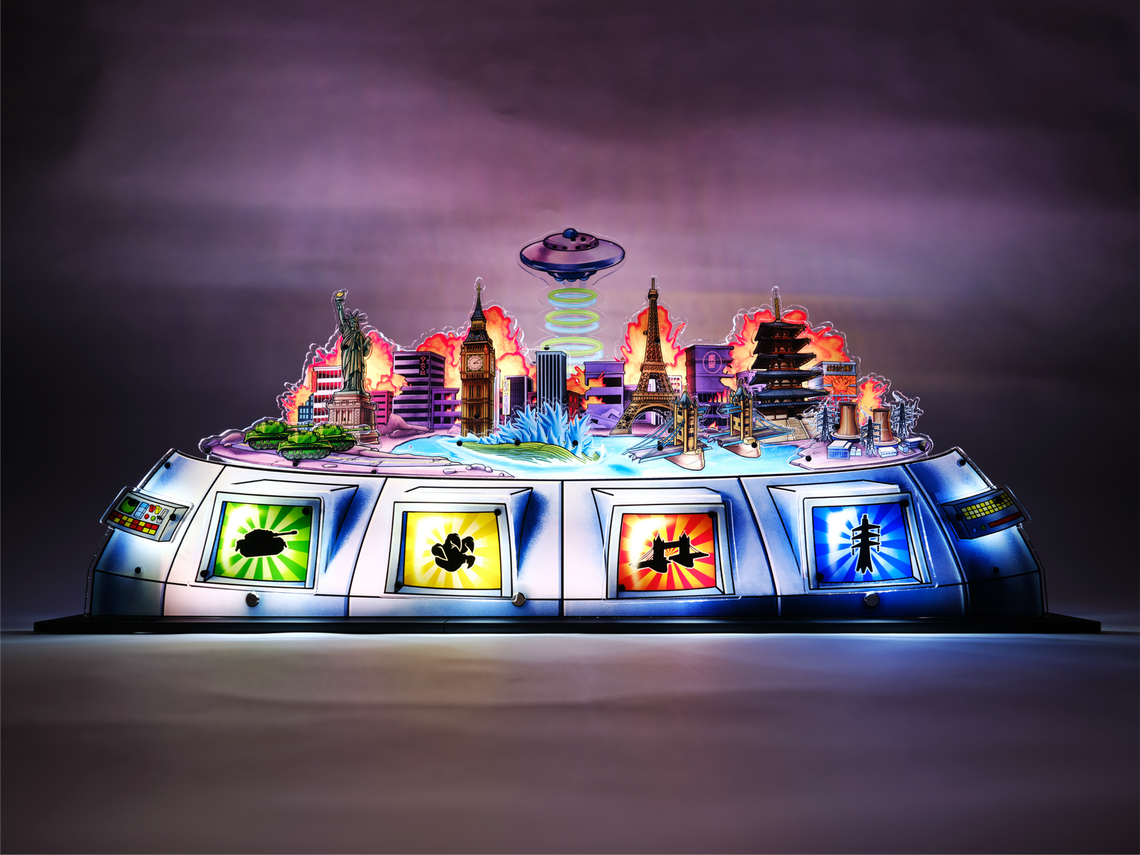 With over 200+ controllable LEDs, watch as the destroyed city scapes and mission monitors come to-life in sync with your game progression, and provide a lightshow that will illuminate any gameroom. Upgrade to the “Challenger Edition” and watch as a mechanical UFO Mothership raises from the background and provides spectators with yet another “wow moment” in one of the greatest games ever made.