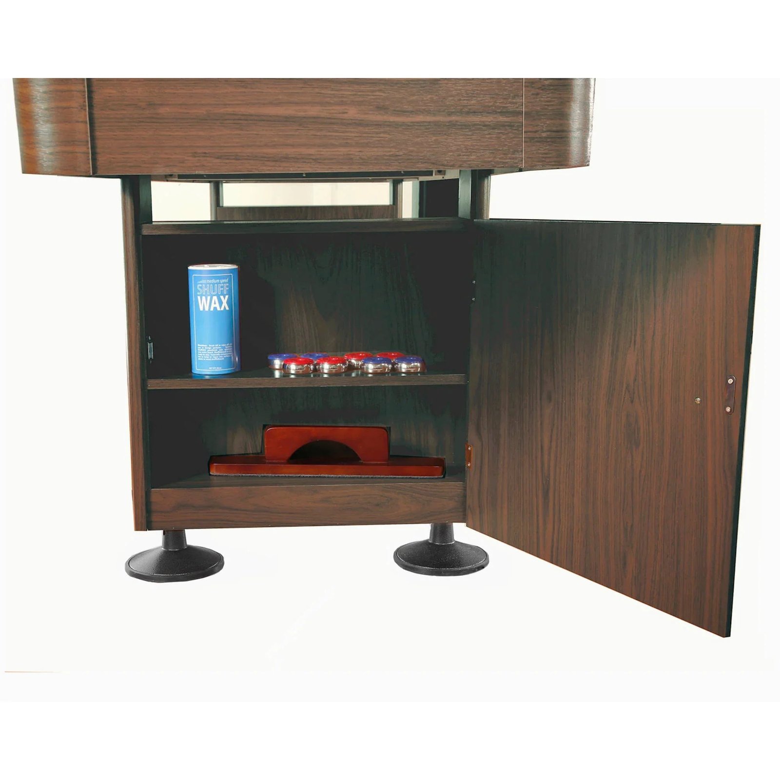 • Complete set includes 2-5/16″ regulation pucks (4 blue, 4 red), abacus scorers, surface wax, and fitted table cover
