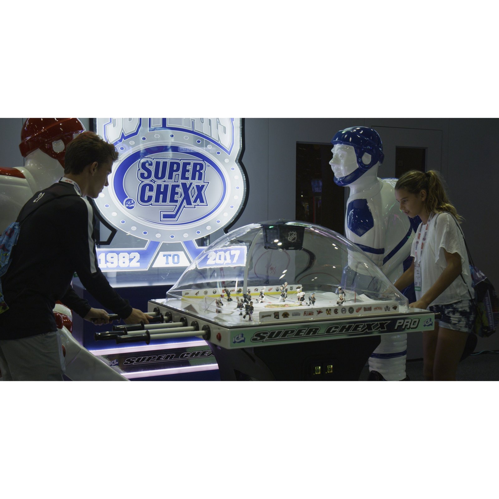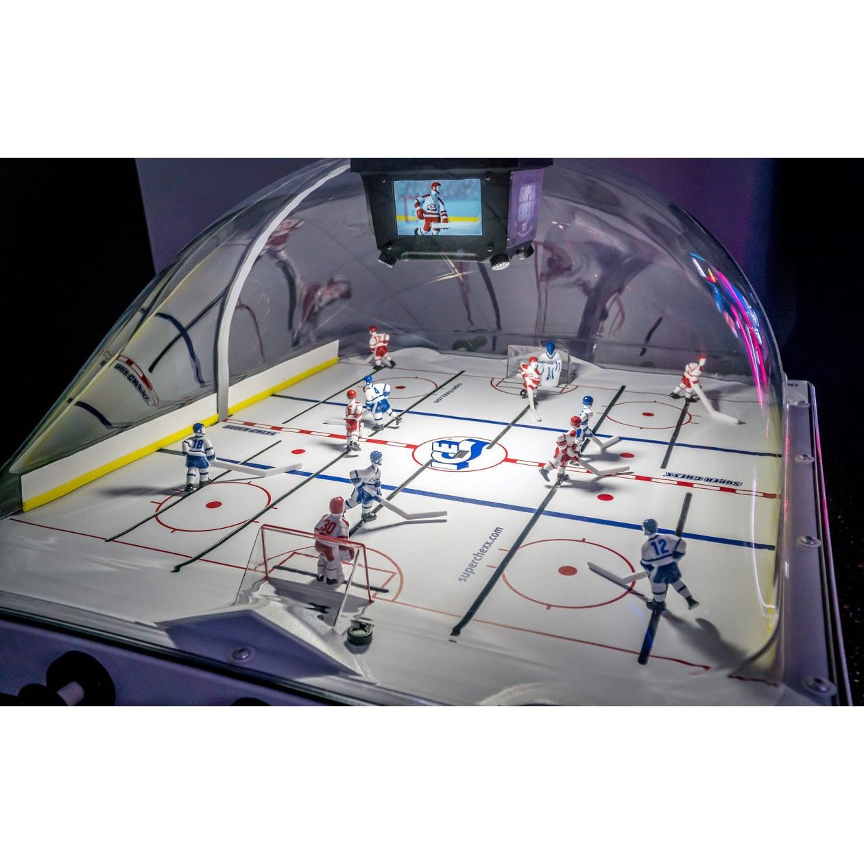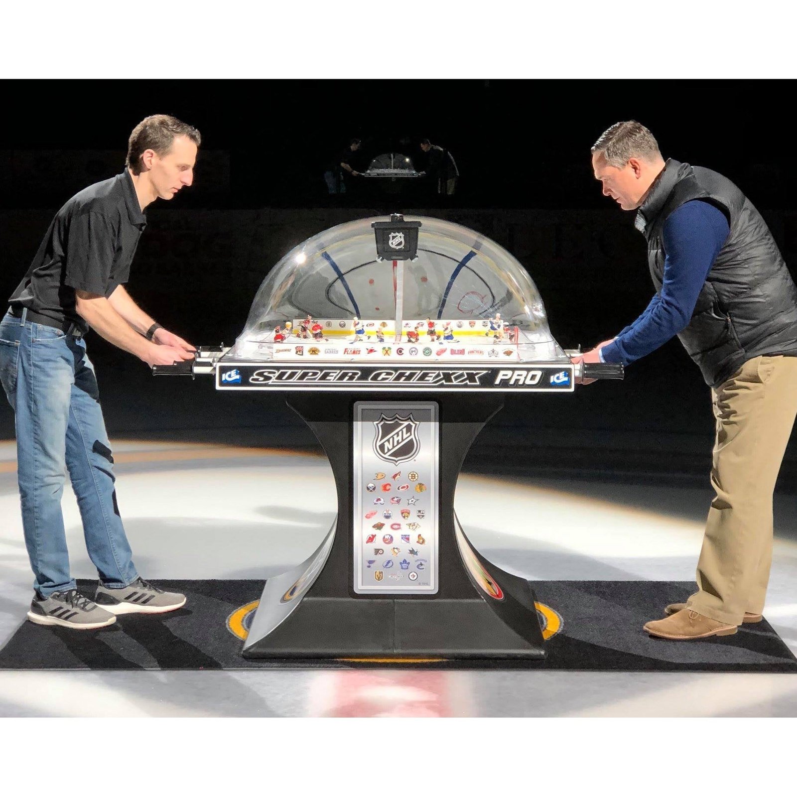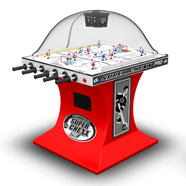 The next generation of Chexx bubble hockey is here – Super Chexx Pro! The exciting bubble hockey table game includes all new electronics, 5″ LCD Jumbotron, animated videos, live-action game calls, and LED lighting.