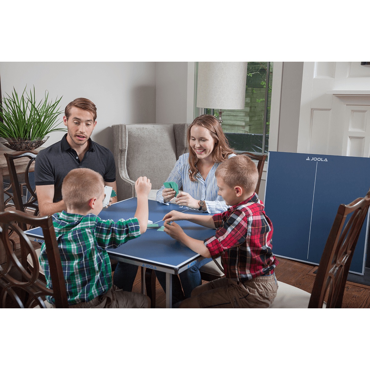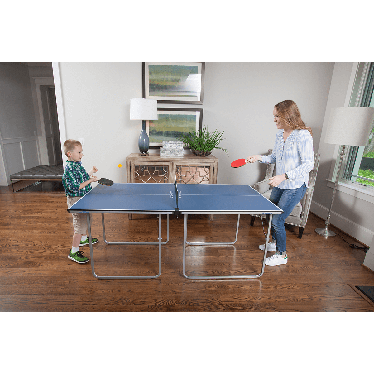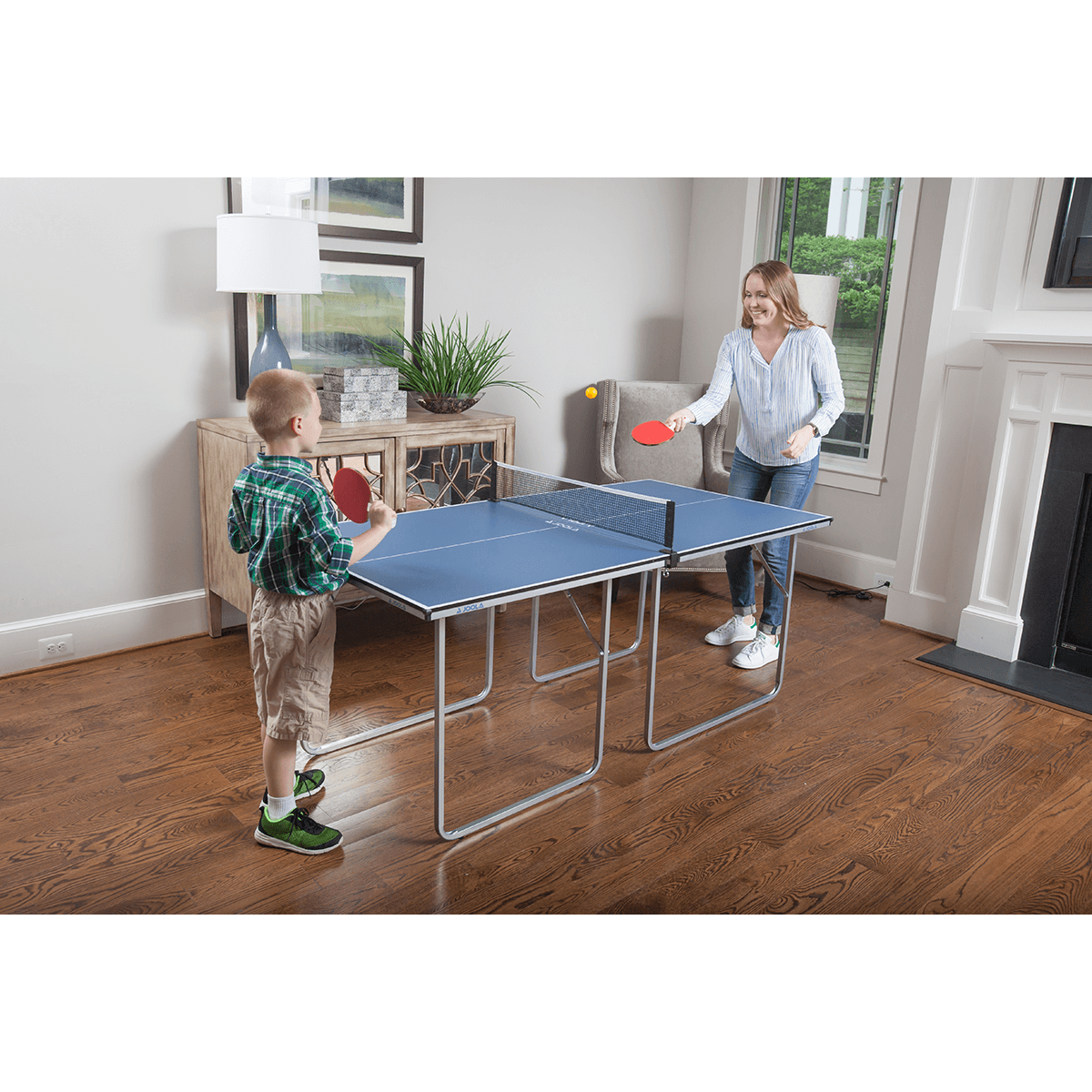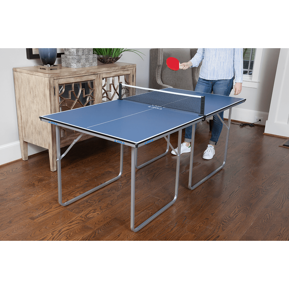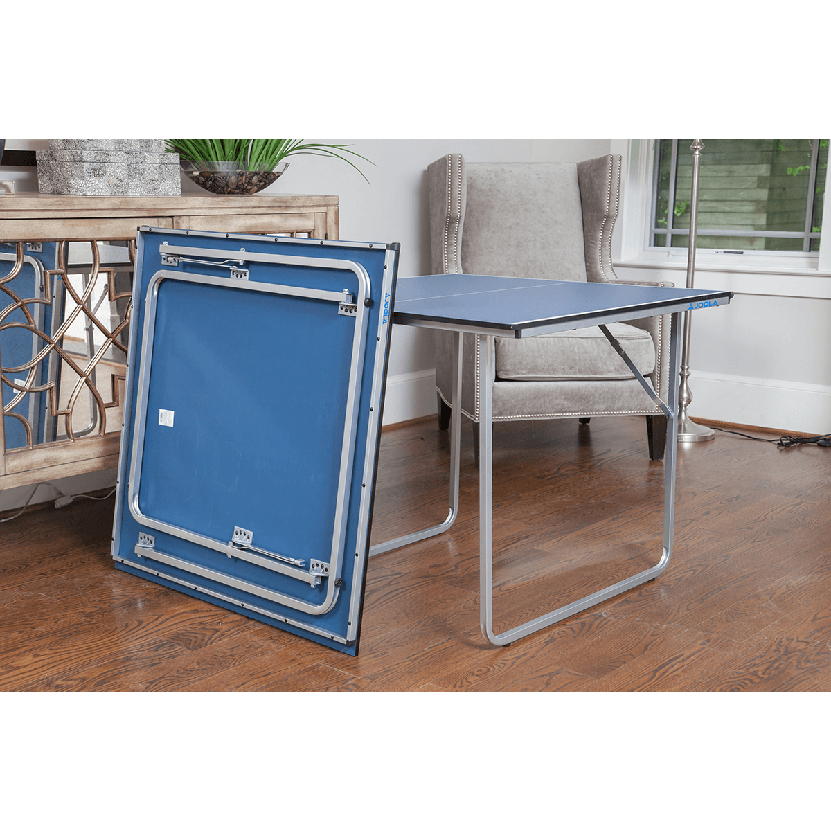 The JOOLA Midsize Blue Table Tennis Table is perfect for anyone who loves table tennis, but is tight on space. Each half of the table is a near perfect square and can stand alone. Other than ping pong, this multi-use table perfect for card games or any of your other table needs.