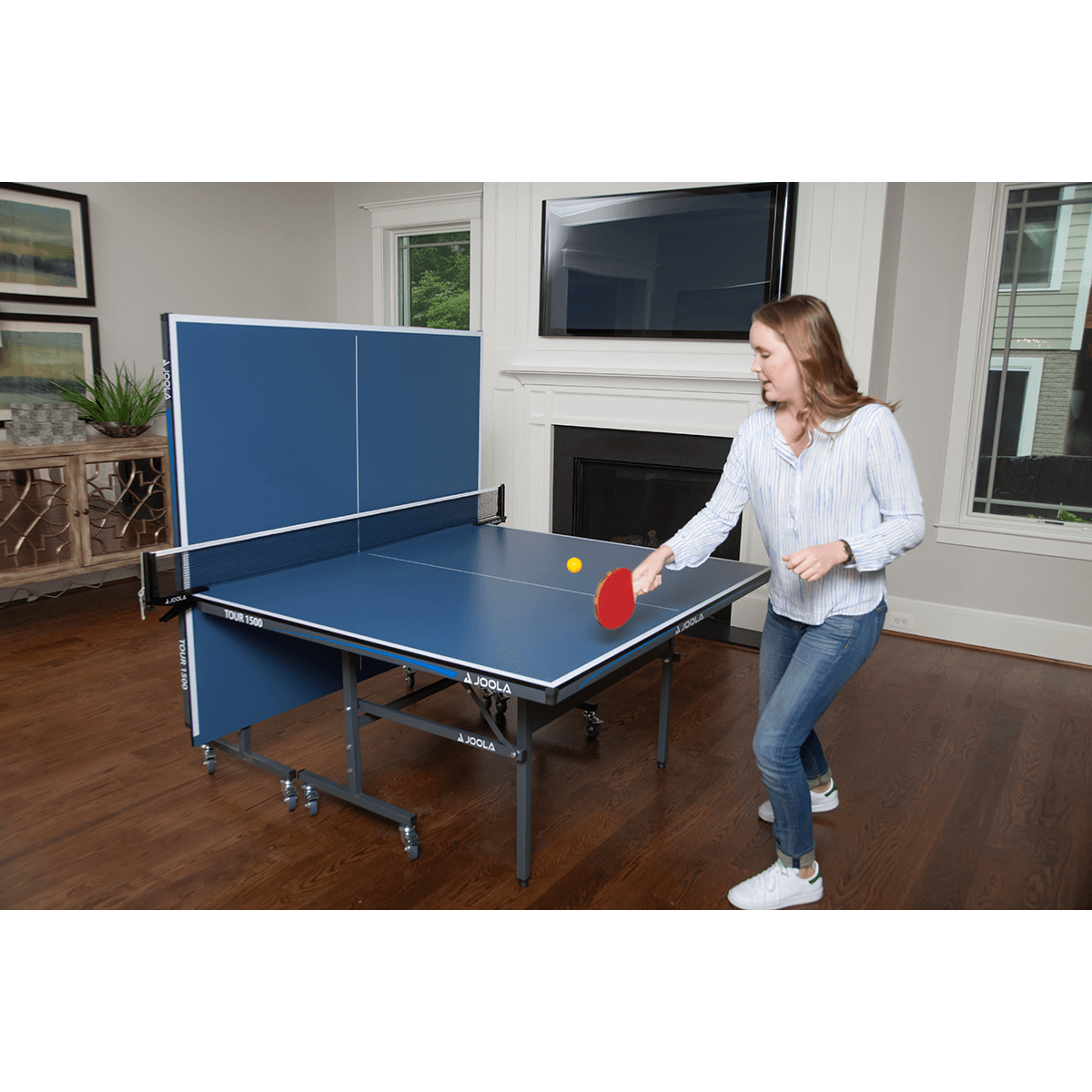 The JOOLA Tour 1500 Indoor Table Tennis Table and Net Set works great in homes, recreational centers and even schools. The 15mm-thick playing surface ensures a better, consistent bounce. Packed 95% pre-assembled, this table only takes 15 minutes to put together. The JOOLA Tour 1500 is USATT Approved.