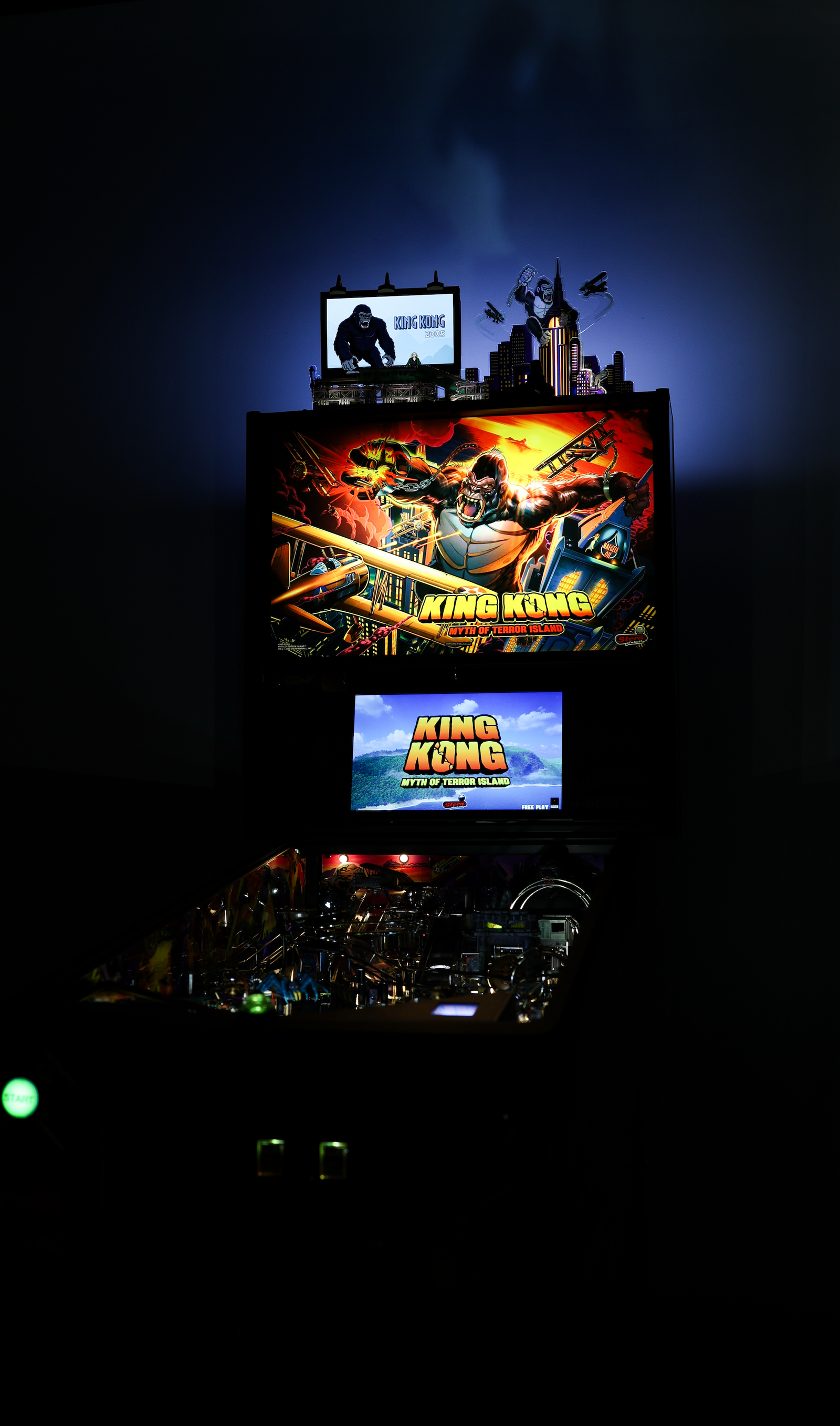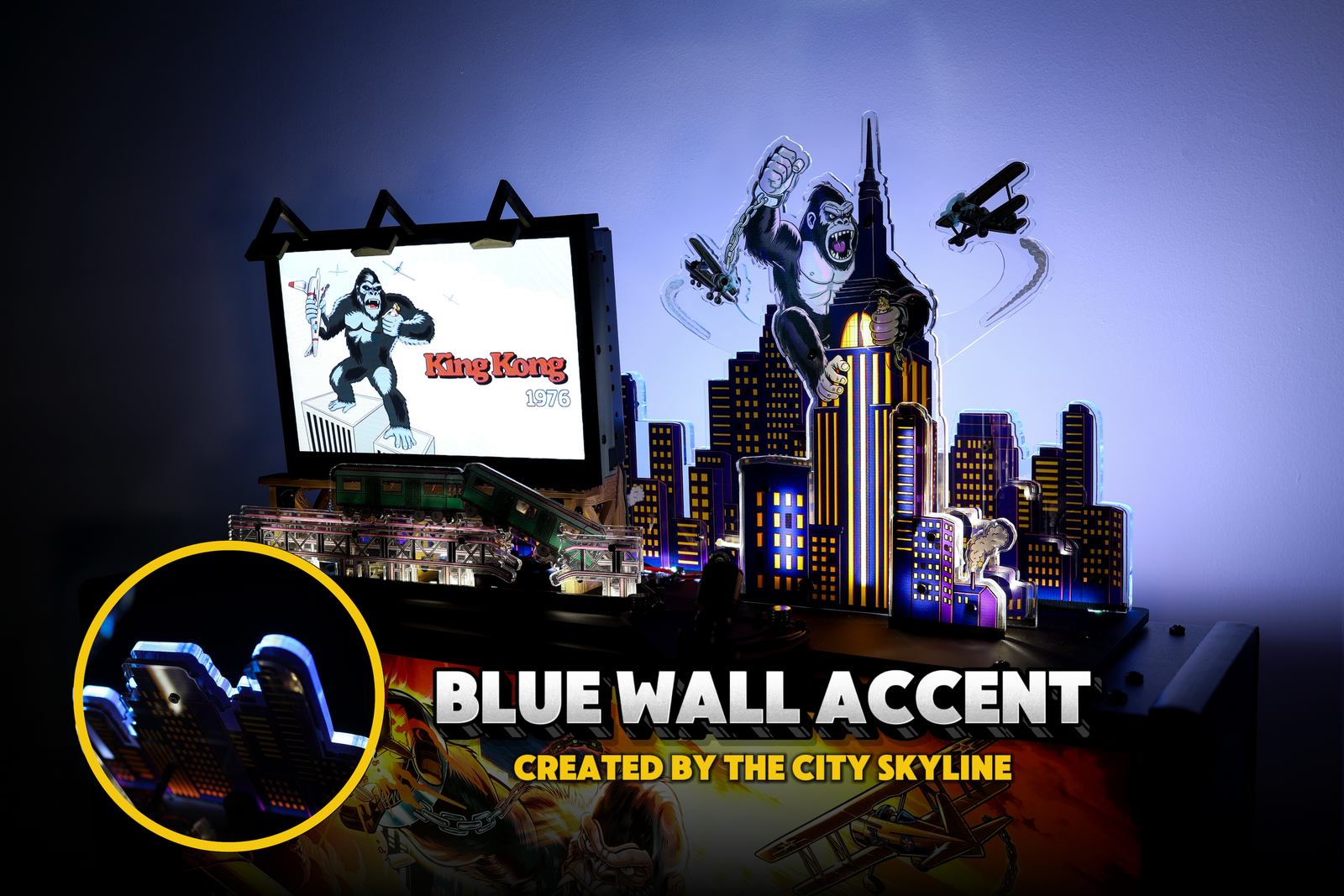Featuring iconic imagery and artwork that matches the game and a dynamic, interactive lighting experience that illuminates the city skyline as well as your gameroom. Rip those spinners and see an interactive spotlight light up Kong on top of the Empire State Building casting a cool strobing shadow effect onto your gameroom’s wall!