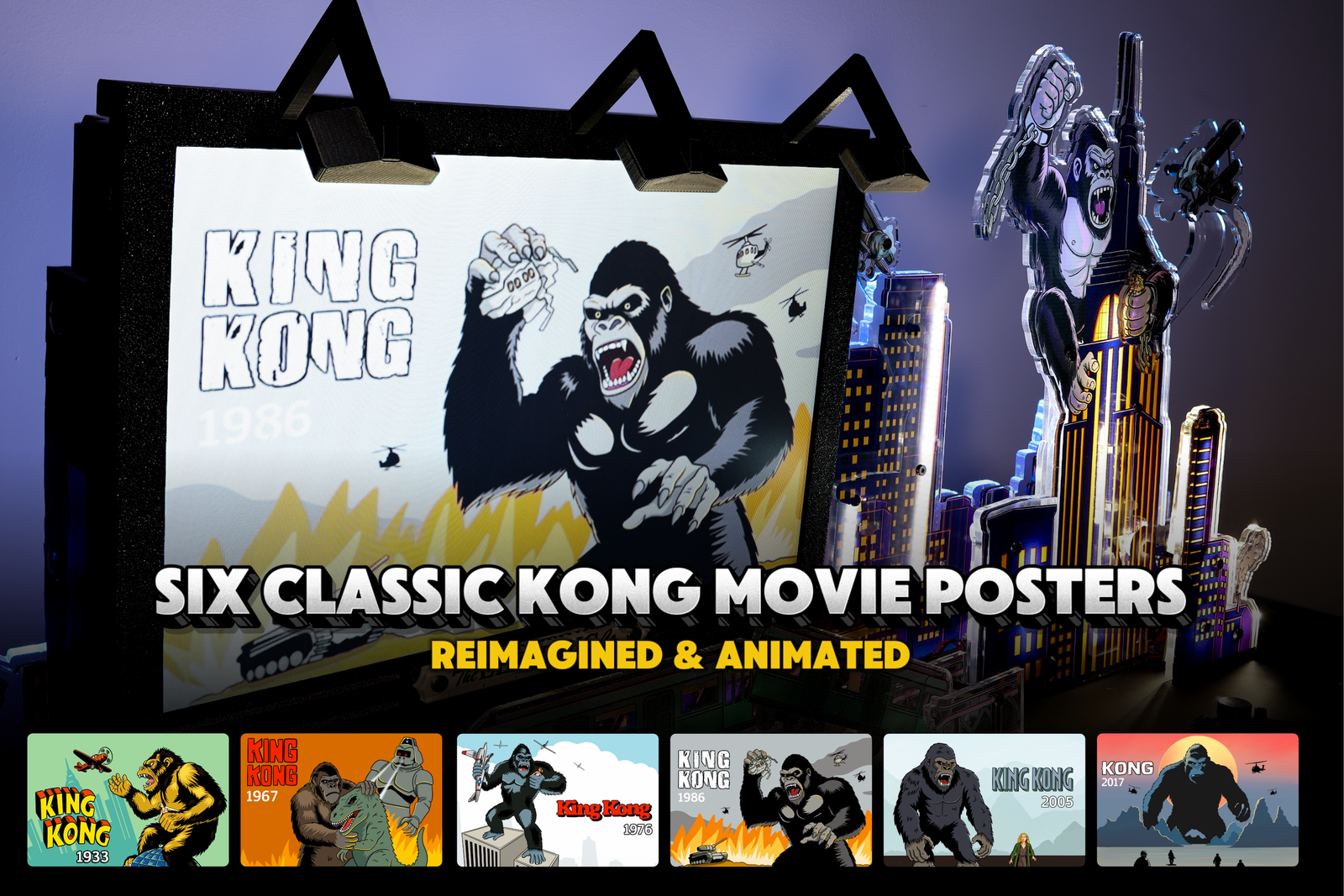 The digital display features animated recreations of 6 classic King Kong Movie posters, ranging from 1933 to 2015, playing on a looping cycling.