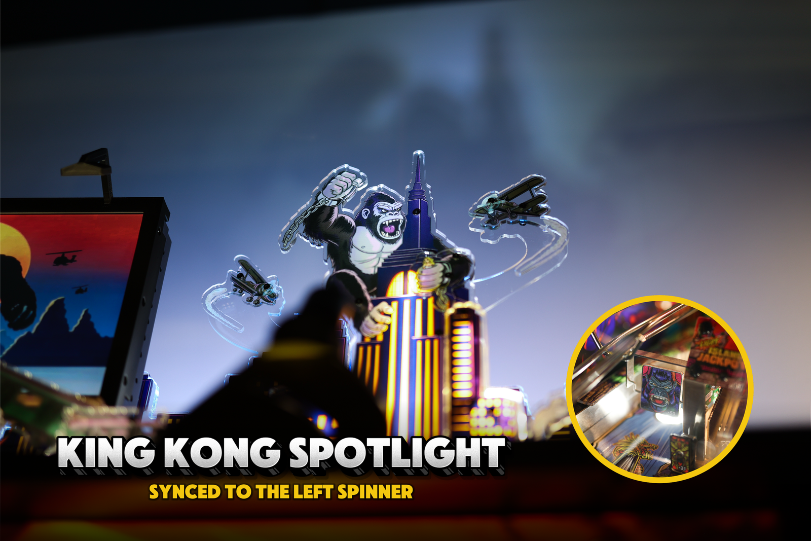 Interactive spotlight tied to the game’s spinners, casting a flashing strobe on King Kong when hit, as well as creating an ominous King Kong shadow on the wall behind the pinball machine. Also creates the same awesome lighting effect at the start of Kong Multiball and other modes.