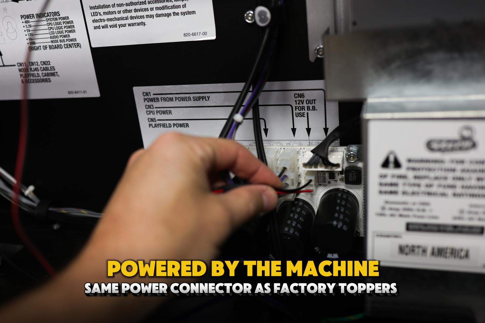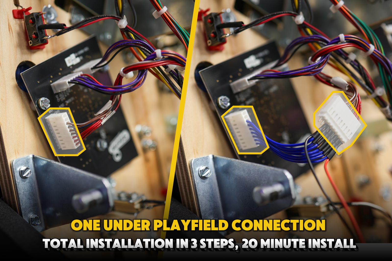 Install in 3 easy steps – secure it to the top of your game using the existing mount screws, plug in the power into the backbox of the game, connect the splitter to a lightboard underneath the playfield.