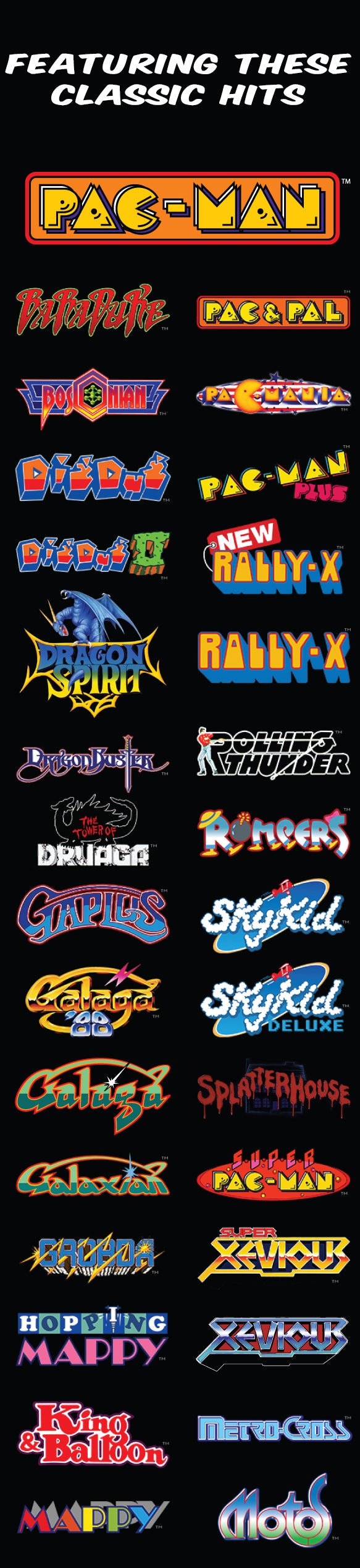 Bosconian™, DigDug™, Dragon Spirit™, Galaga™, Galaga 88™, Galaxian™, Mappy™, PAC-MAN™, Ms.PAC-MAN™, Pac-Mania™, Rally-X™, Rolling Thunder™, Xevious, Baraduke™, Dragon Buster™, DigDug II™, Tower of Druaga™, Gaplus™, Grobda™, Hopping Mappy™, King & Balloon™, Metro-Cross™, Motos™, New Rally-X™, Pac & Pal™, PAC-MAN Plus™, Rompers™, Skykid™, Skykid Deluxe™, Splatterhouse™, Super PAC-MAN™, Super Xevious™& ©Bandai Namco Entertainment Inc.