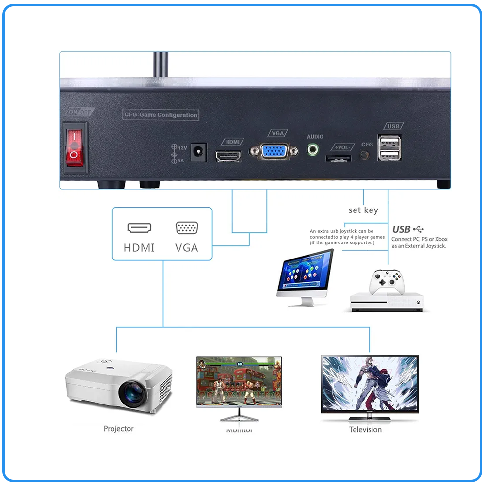 [Multiplayer, Wide Compatibility] Supports 1- to 4-player games, making it perfect for playing with friends and family. Compatible with HDMI, VGA, and USB outputs, it easily connects to a TV, PC, projector, Xbox 360, or PS3.