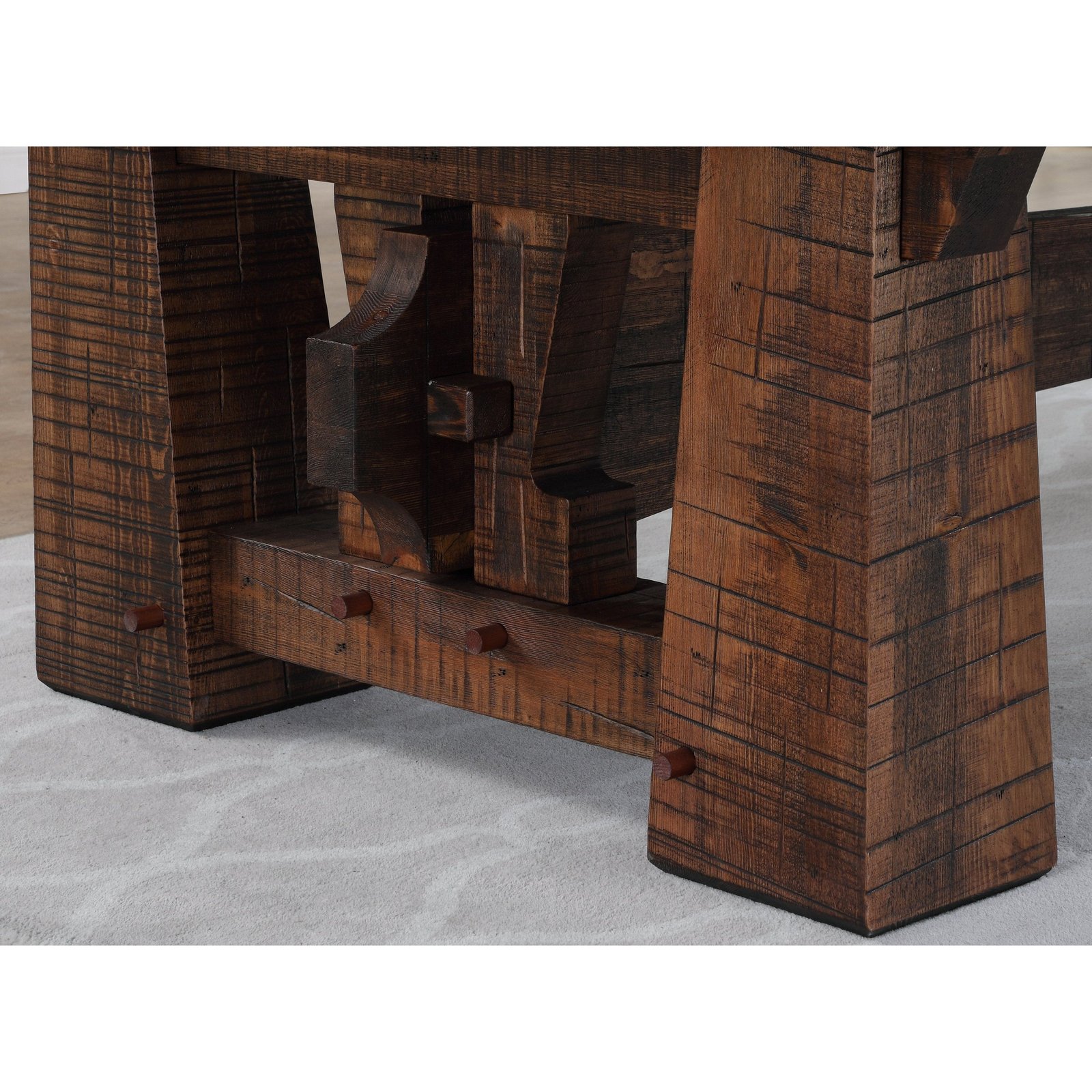 • DISTRESSED FINISH: The hardwoods used are distressed, weathered and rough-hewn to provide the look that reclaimed timber was used to craft the table. The finish is applied by hand to create the desired characteristic of color variability between components for this popular design statement