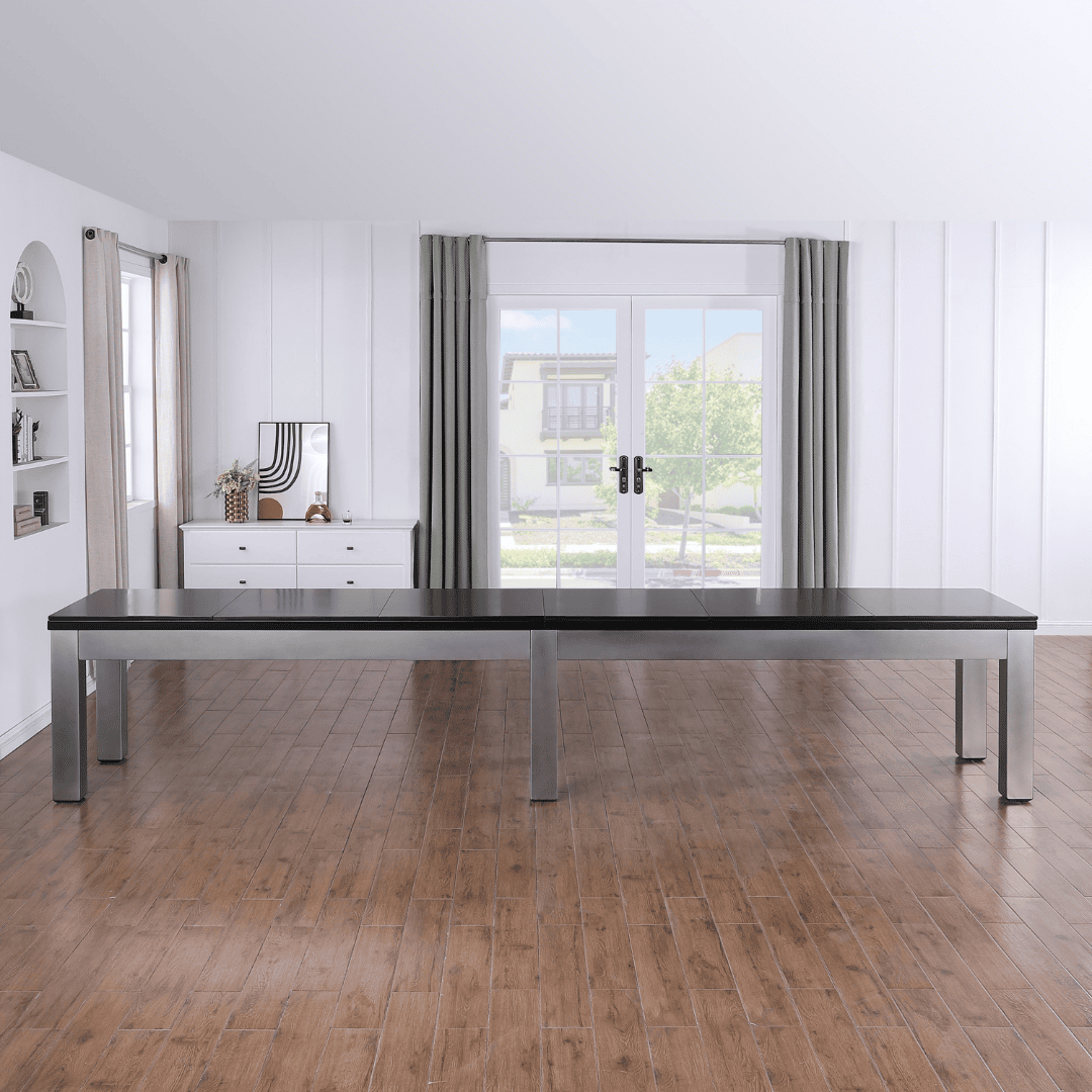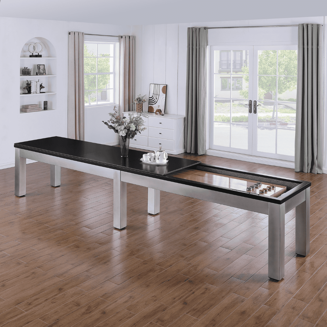 The Playcraft Monaco Pro-Style Shuffleboard Table brings a bold industrial-meets-refined aesthetic to any game room in a Black on Silver finish that pairs striking silver legs and frame with sharp black accents. Available in 12′ and 14′ lengths, the Monaco is engineered for serious play with a 3″ thick, 20″ wide poured polymer hardwood playfield and professional-grade climate adjusters — and it’s designed to pair perfectly with the optional Monaco Slate Pool Table for a fully unified game room.