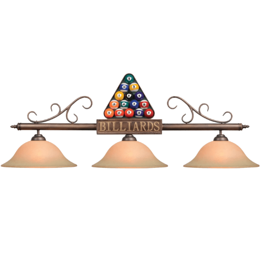 RAM Game Room | 56″- Billiard Balls in Rack | Amber Glass Shades | 3-Shade Light Fixture