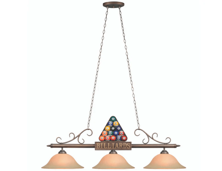 Add a touch of color to your game room with this three-shade billiard light fixture from RAM Game Room. The resin billiard balls are arranged in a beautiful rack, while the metal bar and amber glass shades add a traditional touch. A must-have for any billiards enthusiast.