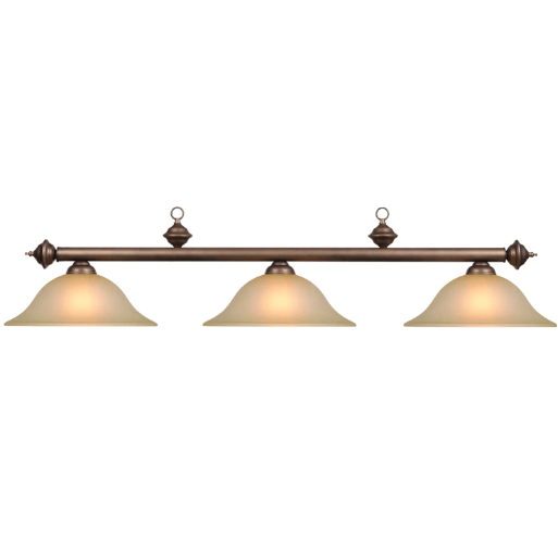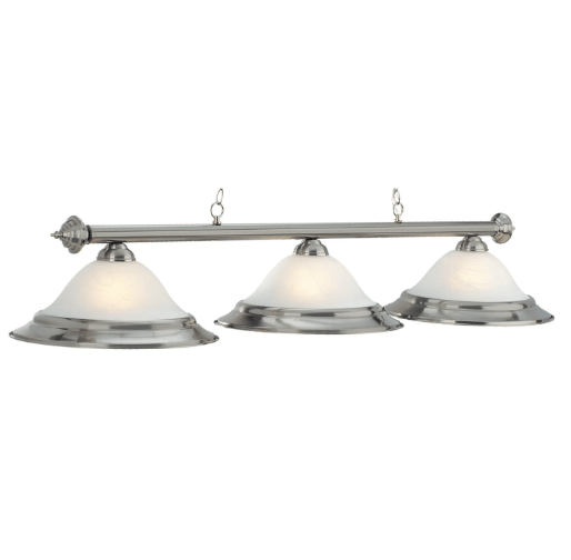 This 60″ billiard fixture boasts a timeless and polished appeal with its alabaster glass shades. The three shades offer focused lighting, making it a great choice for enhancing your game room. Both the metal bar and glass shades come in complementary finishes, while matching rings provide durability to withstand impact from pool cues. Available in a variety of finishes, this fixture provides ample lighting for a home bar or pool table. It hangs from the ceiling by three-foot chains on either side, adding both style and functionality to any room.