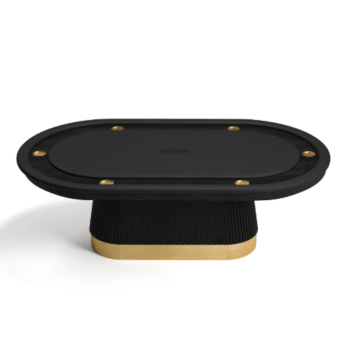 The RAM Game Room Prohibition Series proudly offers the Texas Hold’Em poker table, seamlessly blending luxury and versatility. Meticulously crafted, this table embodies both traditional elegance and modern practicality. The base showcases a sleek matte black wood design, enhanced by either a classic vintage brass kick plate or a contemporary light walnut finish with matte black accents, adding a timeless touch of refinement.