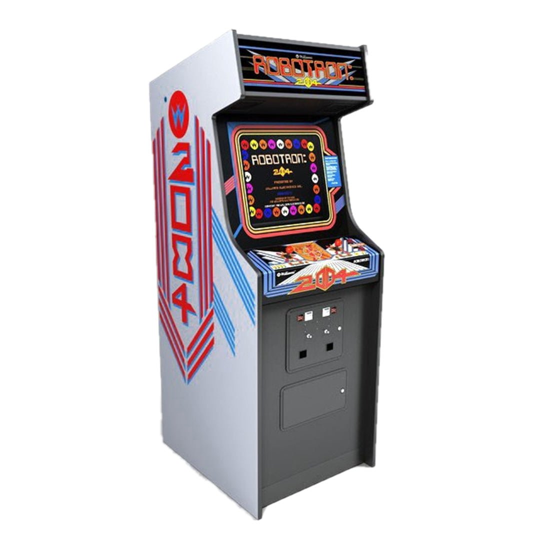 The upright model has specially coloured side art of neon-trimmed robots marching towards a lone figure along a grid. Its sloped control panel has dual ball-top joysticks, movement and fire, below a lettered “ROBOTRON 2084” marquee. A perforated steel grille conceals a mono speaker that throbs the game’s instantly recognizable electronic music score.