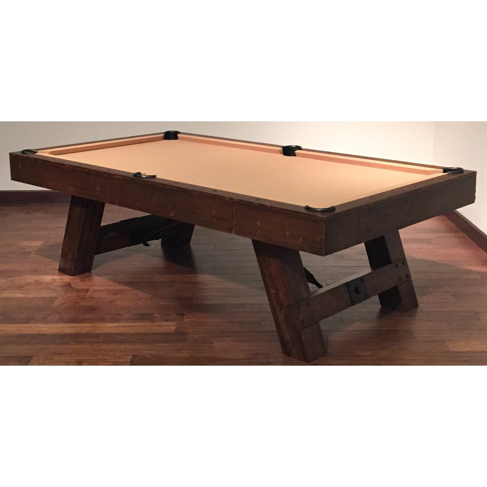 The Savannah is the original farm style pool table with turn of the century aesthetics. The authentic metal turnbuckles and elemental metal rings have an age-old furniture feel combining rustic and individual design elements. This pool table features recessed black hex bolt metal rail sights, a rich charcoal finish, and internal drop pockets.