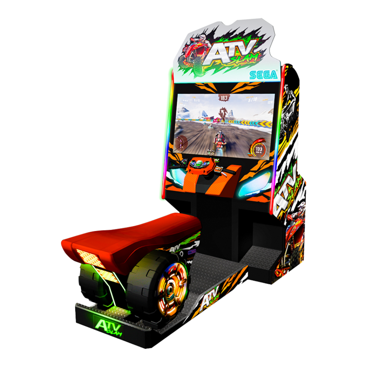 The ATV quadbike seat can accommodate a parent and child. Stylish liveries and awesome lighting effects from top to bottom demands players attention at any arcade.