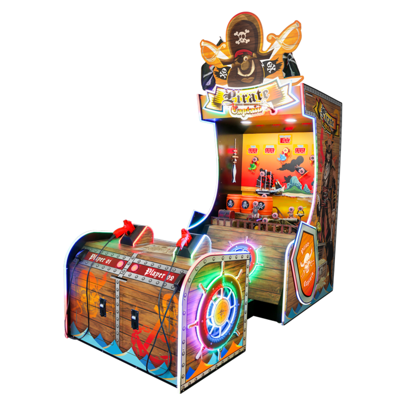 Pirate Captain is a skill based redemption shooting gallery for two players. Beautiful themed artwork and bright LED lighting throughout attracts players young and old. The multicolour ship steering wheel creates an eye-catching feature.
