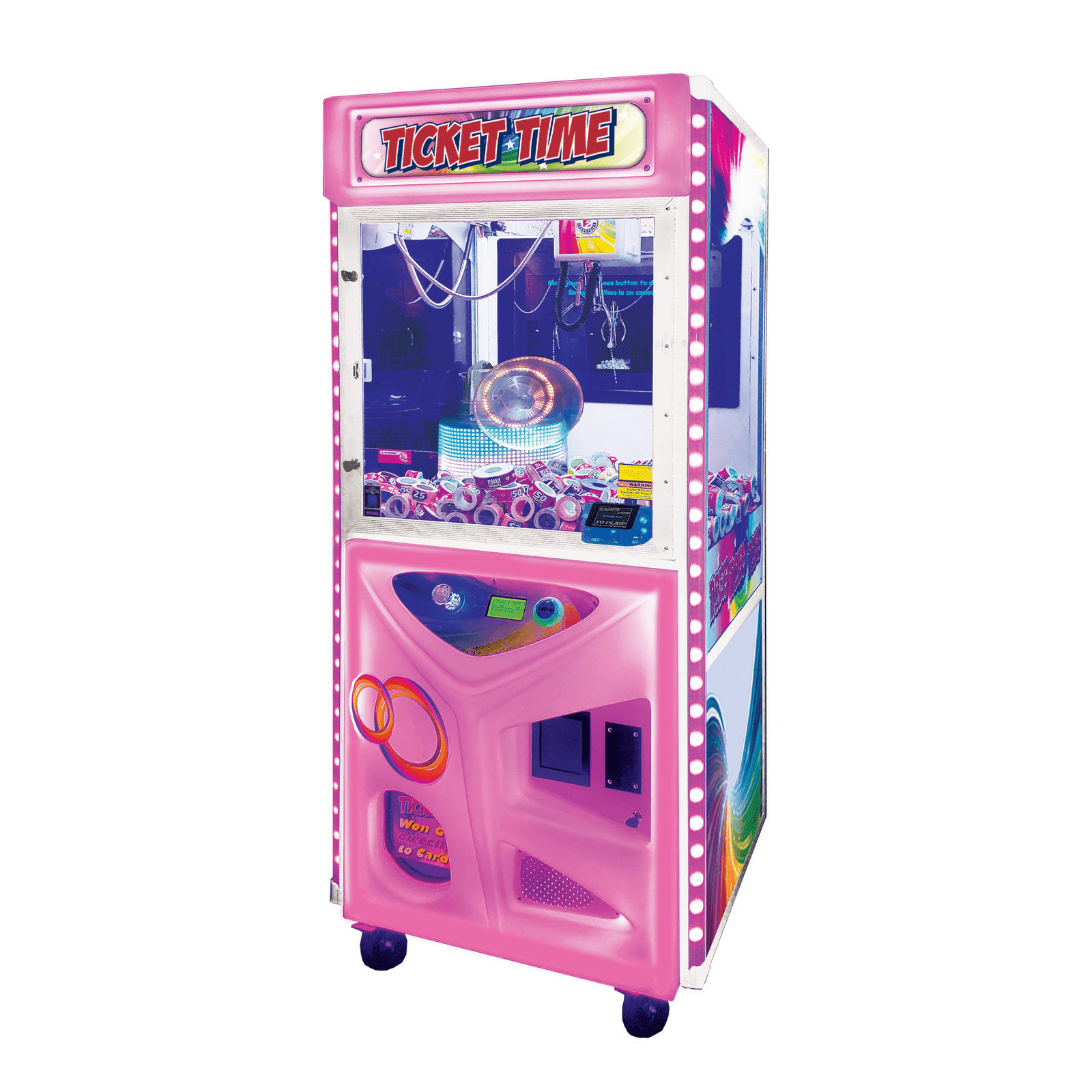 The newest addition from Ticket Time which is the Ticket Time Reload Extreme, offers an unparalleled arcade experience by combining beloved features and innovative elements. One of its highlights is the advanced spinning bowl that rapidly scans ticket rolls, while the Auto Reload feature instantly displays card values and refills rolls without the need for manual reloading. The bowl and frame feature color-changing LEDs (red, green, blue) that enhance the game with a vibrant and eye-catching effect.