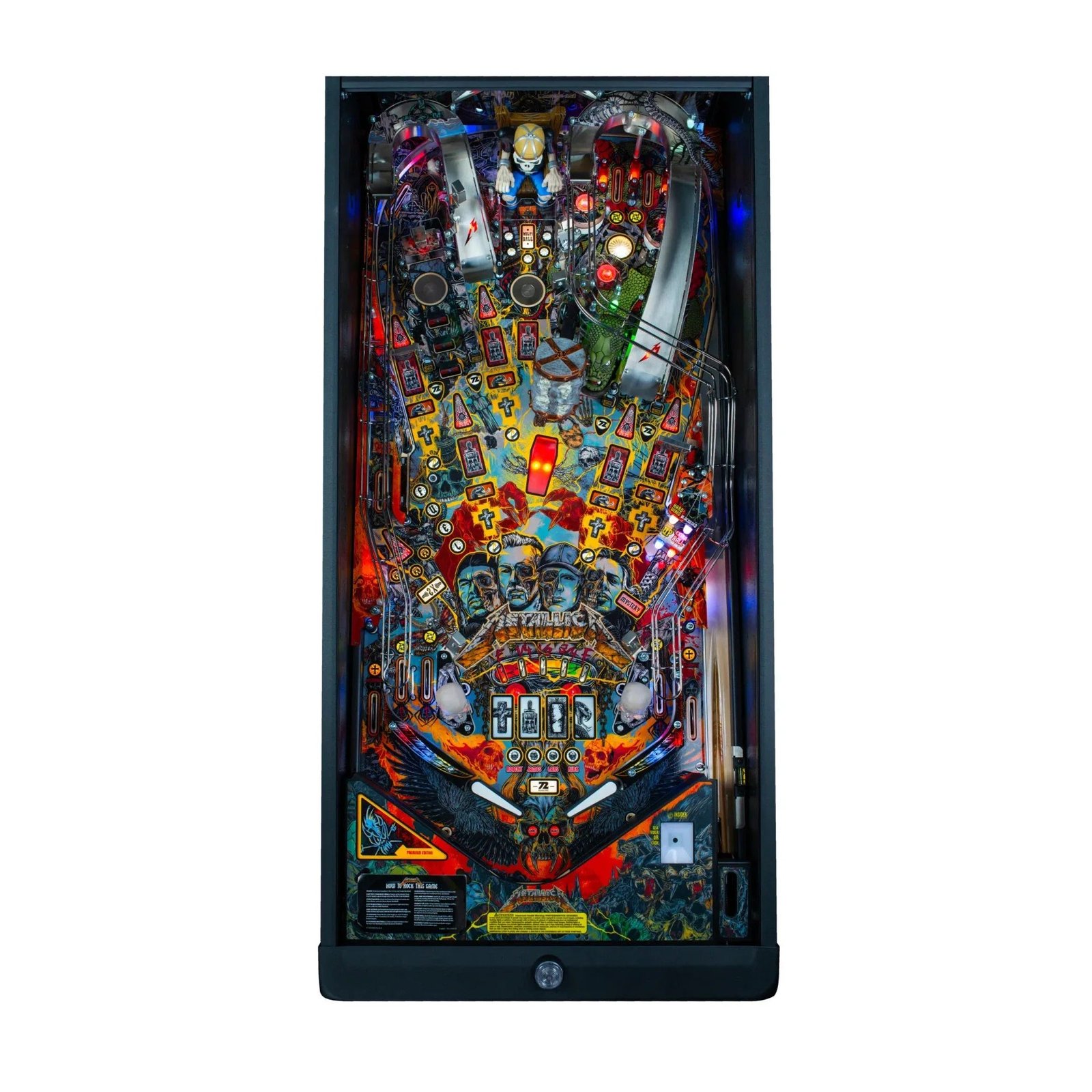 - Enhanced Playfield and Toys: John Borg’s original layout now includes new mechanical devices like Sparky, the Hammer, RGB-lit skulls, and a revamped Metallica logo spell-out. Dramatic UV lighting effects are featured throughout the playfield, particularly around Sparky.