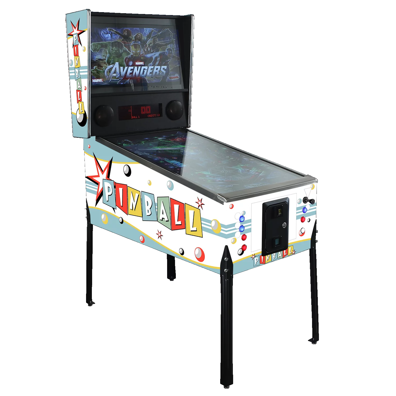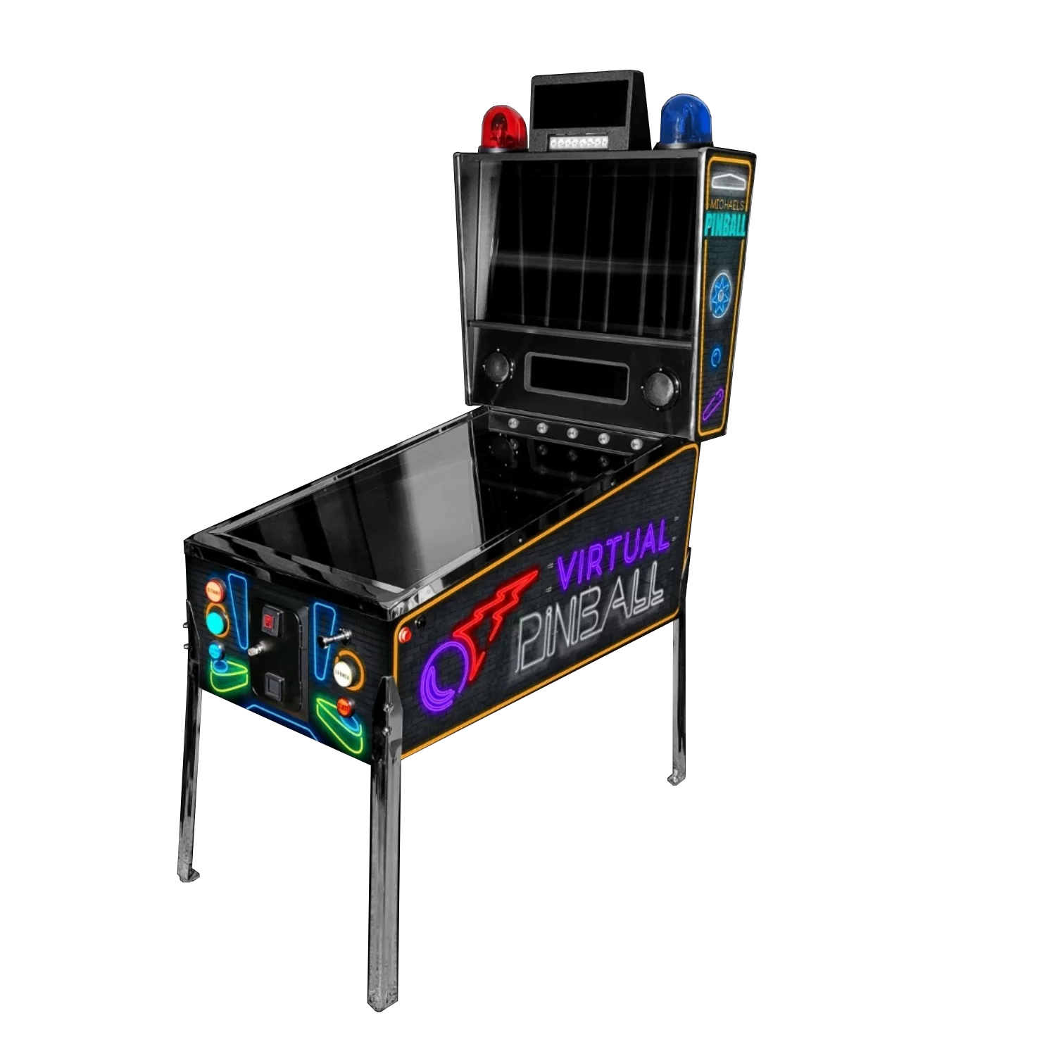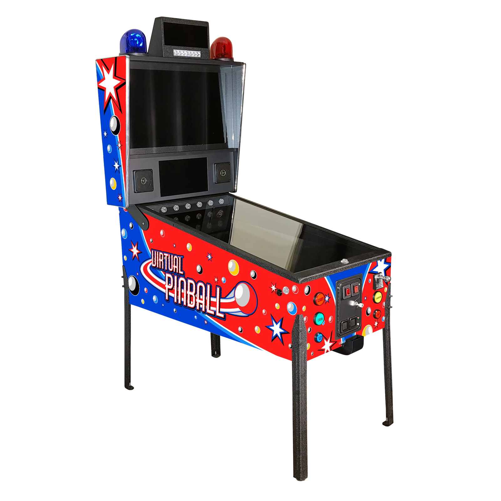 The cabinet functions as both a virtual pinball machine and a retro arcade system.