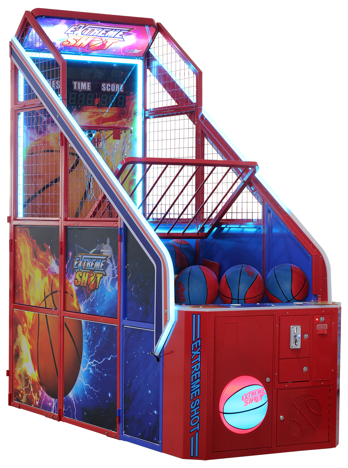 The UNIS Extreme Shot Arcade Basketball Game offers an engaging challenge where players aim to score as many baskets as possible before time runs out. It includes four dynamic stages with moving hoops, housed in a durable steel cabinet. Its modern design is enhanced by color-changing LED lights, and it supports linking up to 18 units for competitive multiplayer action, making it a premier choice for testing basketball precision and speed.