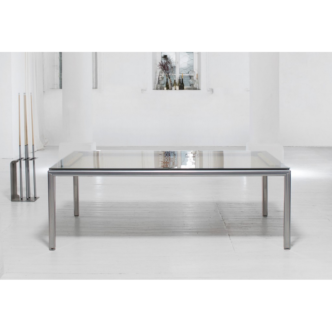 Convertible Dining Top: An ultra-thin top converts the table for dining at the perfect height, available in clear glass, frosted glass, enamel-coated glass, or stained and painted wood.